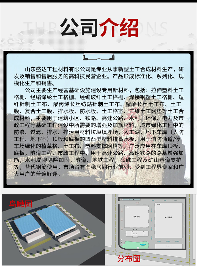 山东盛达工程材料有限公司是专业从事新型土工合成材料生产,研发及销售和售后服务的高科技民营企业。产品形成标准化、系列化、规模化生产和销售。公司主要生产经营基础设施建设专用新材料,包括:拉伸塑料土工格栅、经编涤纶土工格栅、经编玻纤土工格栅、焊接钢…