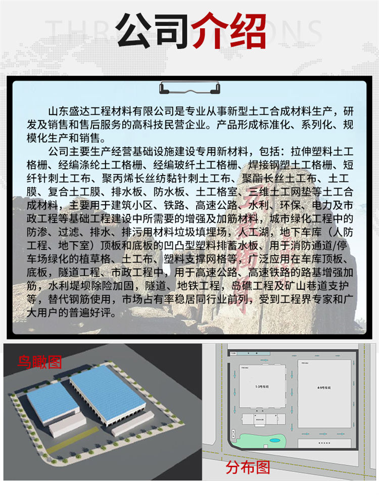 山东盛达工程材料有限公司是专业从事新型土工合成材料生产,研发及销售和售后服务的高科技民营企业。产品形成标准化、系列化、规模化生产和销售。公司主要生产经营基础设施建设专用新材料,包括:拉伸塑料土工格栅、经编涤纶土工格栅、经编玻纤土工格栅、焊接钢…